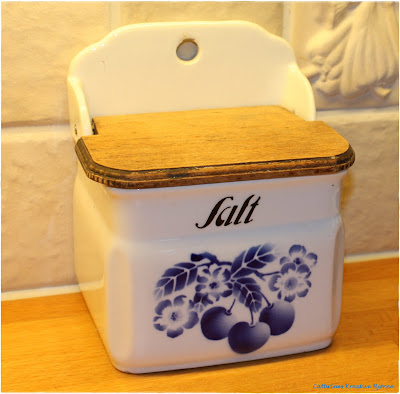 Jeg har fått prøvd meg litt med den nye kameraet mitt nå, og her en noen kjøkkenbilder! Og som dere ser har vi til SALT på maten! Dette saltkaret fikk jeg kjøpt på marked i Gamlebyen i Fredrikstad for noen år siden, og under står det INGE. Og på toppen av skapet har kjelene økt fra 2 til 3, etter at jeg fikk den lille av min mor før jul! Her ser du den med svibel i!